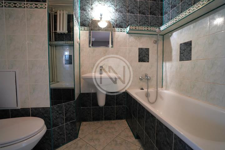 Łazienka wyposażona w wannę, toaletę umywalkę i szafki do przechowywania oraz lustro.