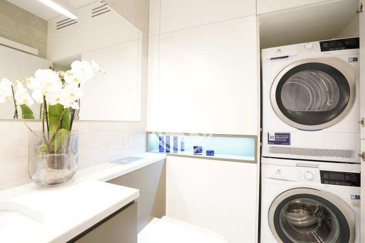 Łazienka wyposażona w wannę w funkcją prysznica, umywalkę i meble do przechowywania. Dodatkowo znajdują się tu pralka i suszarka automatyczna do ubrań.